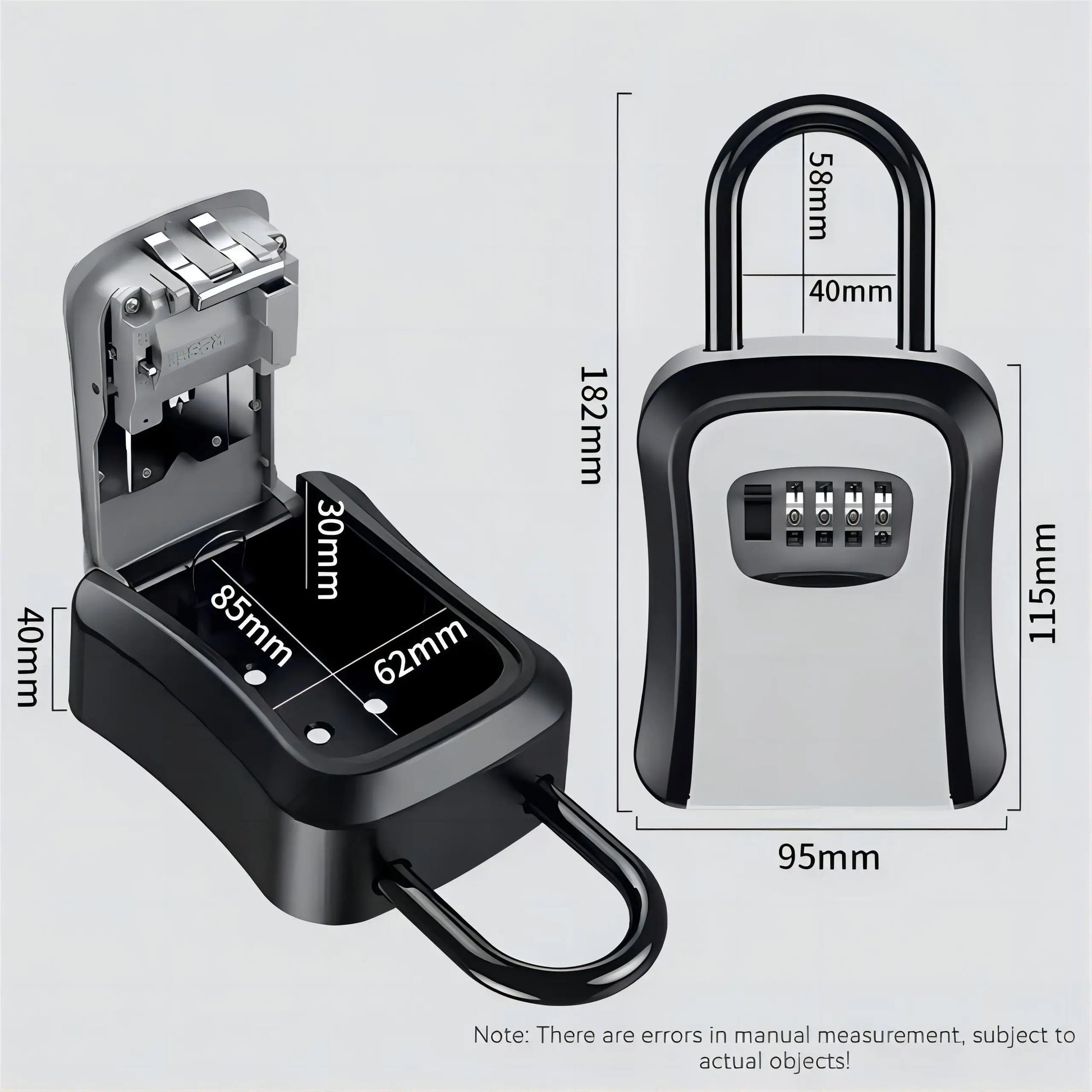 This key combination lock box is made of ABS material, which is very durable and effective waterproof and sun protection; Large space capacity can store more items; Four-digit password, multiple password combination, to ensure safe storage; Hang up at any time, can be recycled, go out without a key