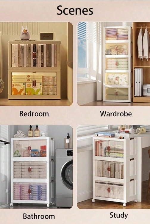 - 【Tool-Less Installation & Mobile】 The storage bins with lids and wheels are a new storage organizer with a foldable design. Each layer of the top has buckle on both sides, which can lock each layer of closet organizer firmly, no need to worry about the storage cabinet plastic falling. Each bin features special grooves on the top and bottom for secure stacking and 4 rotating wheels for effortless mobility.